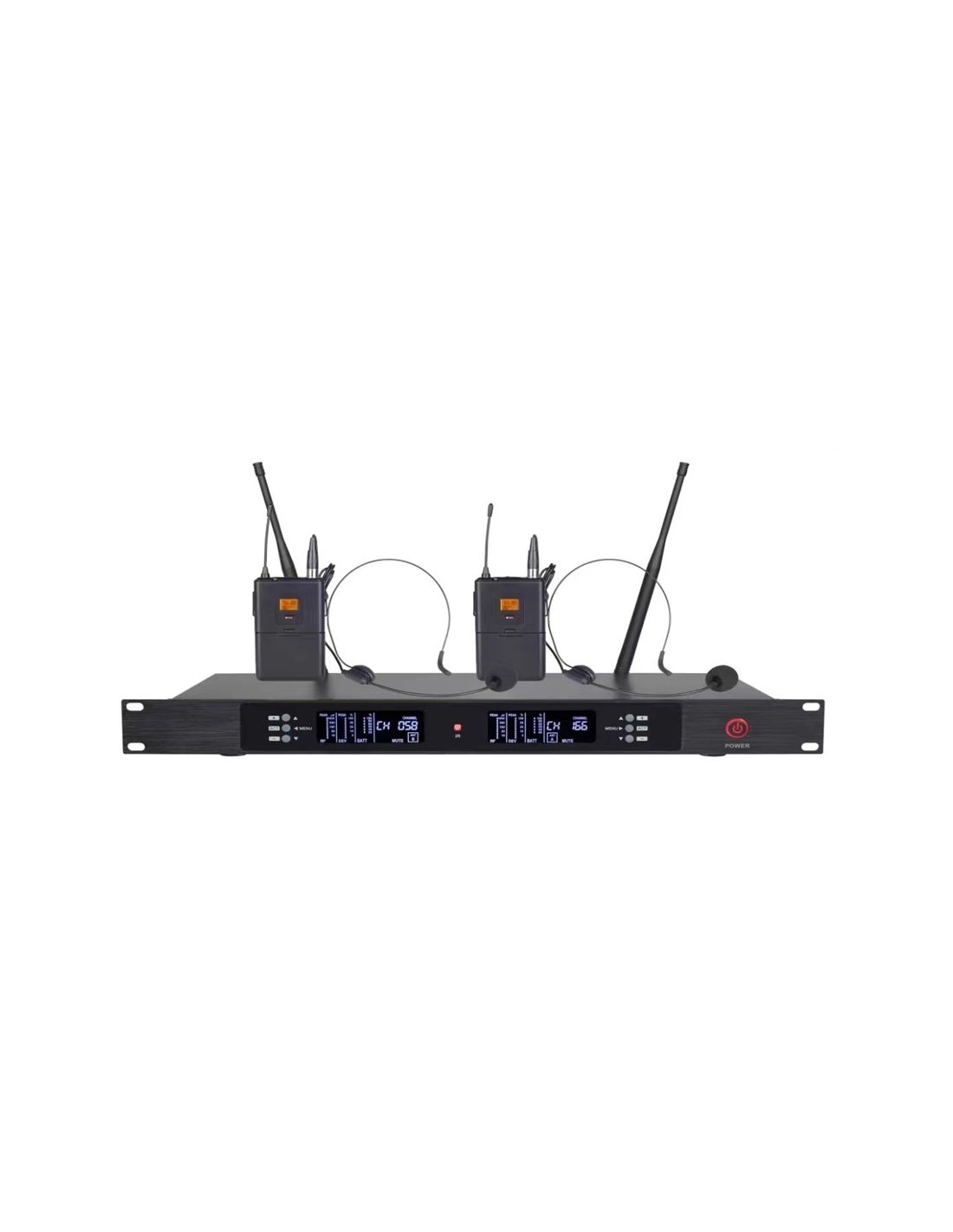 Бездротова двоканальна мікрофонна система з наголовними гарнітурами, що забезпечує високу якість звуку та надійну передачу сигналу. Ідеально підходить для виступів, театрів та конференцій.